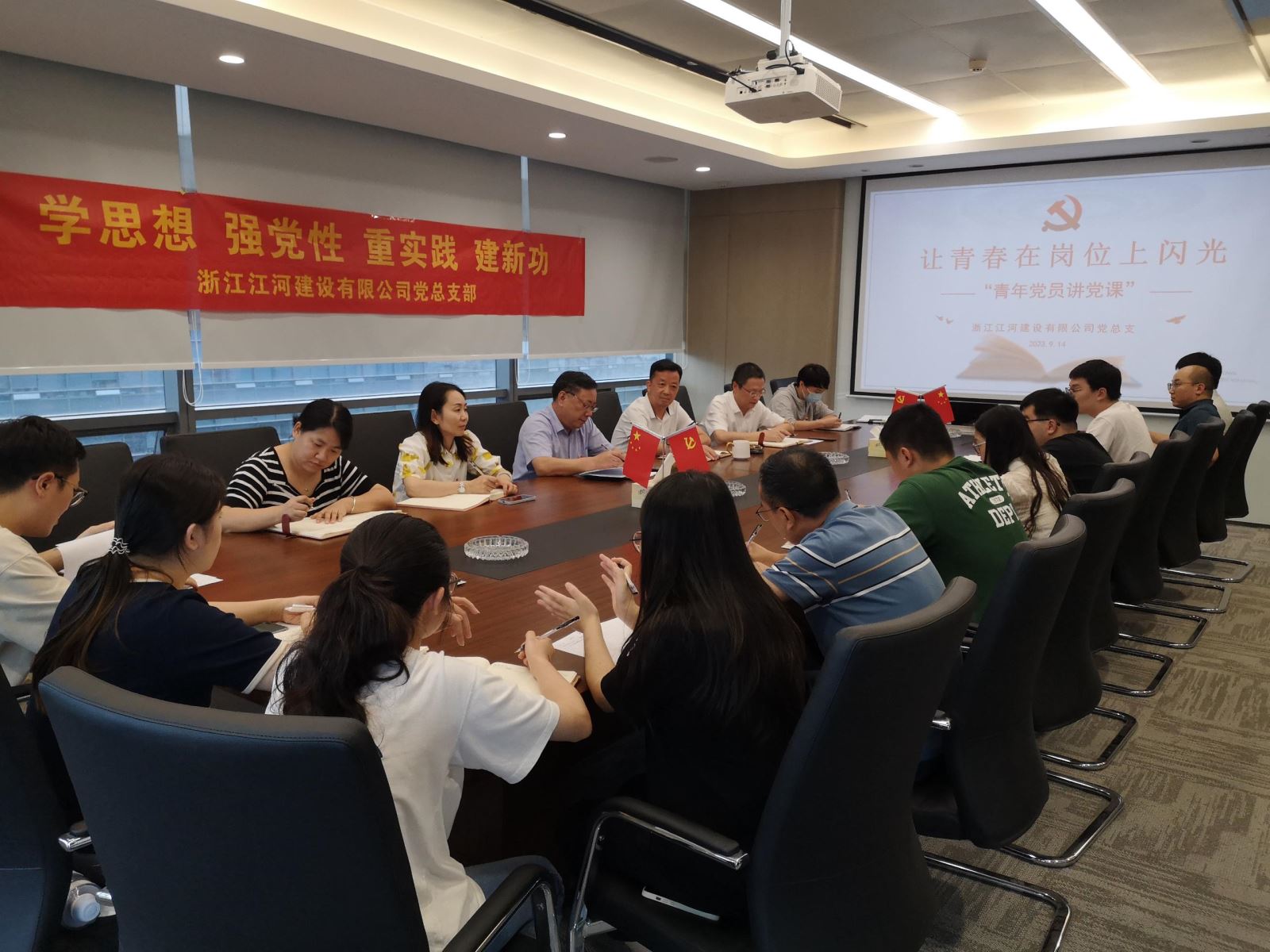 為深入學習貫徹黨的二十大精神,進一步激發青年黨員投身創新深化、改革攻堅、開放提升的活力,推動公司青年黨員在各項工作中沖在前、做先鋒。9月14日下午,浙江江河建設有限公司黨總支舉辦“青年黨員講黨課”活動。公司黨建指導員、上虞建筑業管理局原局長徐沛生蒞臨活動現場指導,為建筑業企業管理和發展指明了方向,對青年黨員和年輕員工提出了希望和要求。公司黨總支書記、董事長袁偉忠作了題為《點燃干事激情,挺膺擔當作為,馳騁青春奮斗路》的重要講話。公司全體黨員、預備黨員、流動黨員、入黨積極分子,非黨年輕職工代表參加了活動。