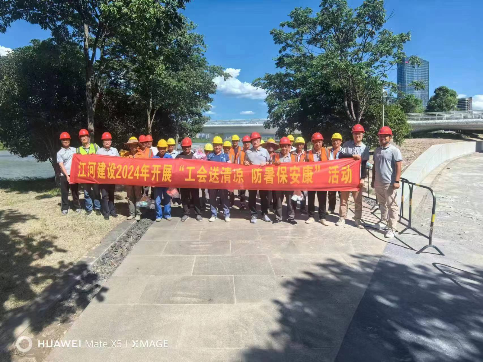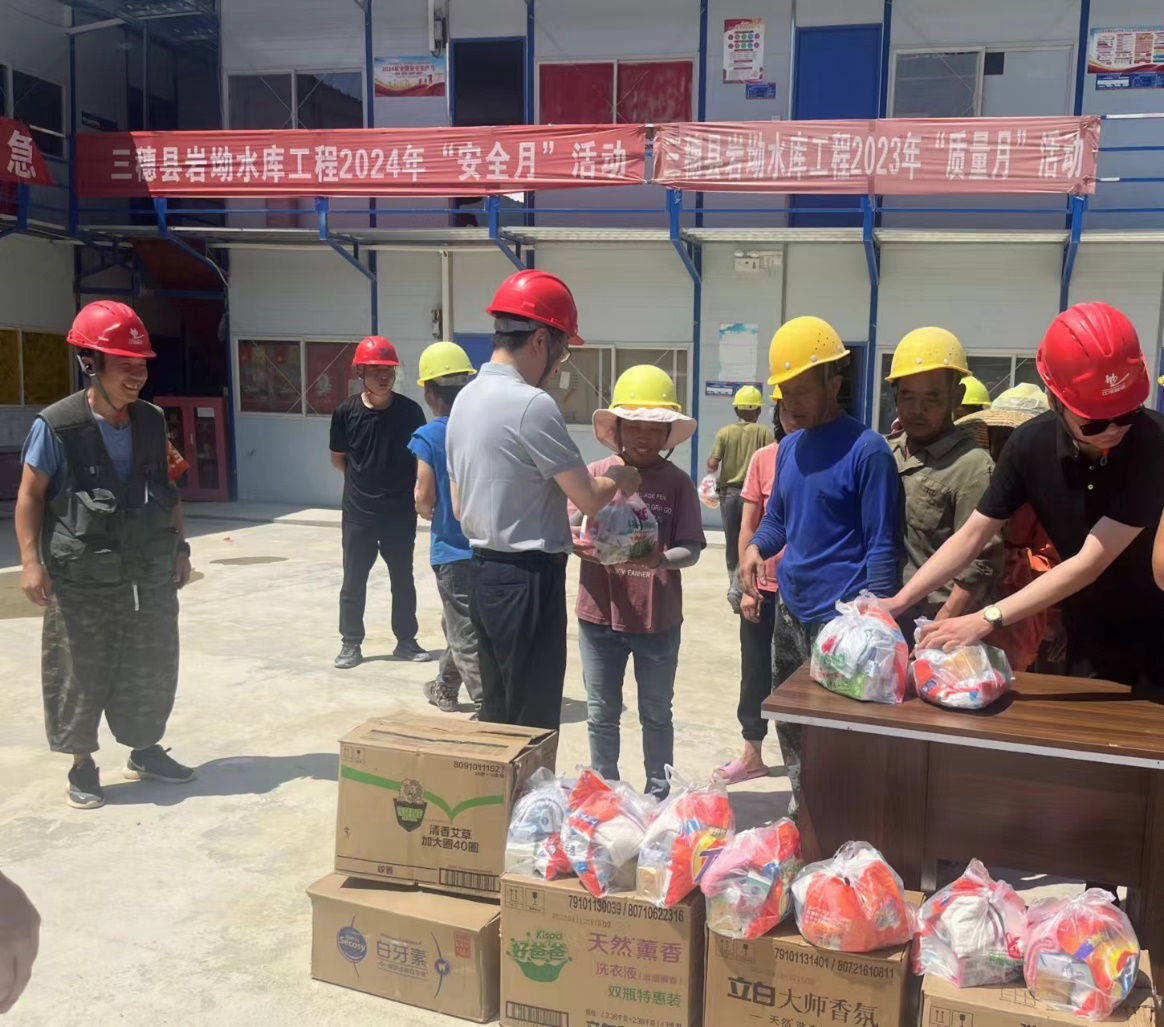 盛夏焦月,驕陽似火,江河建設各重點在建工程項目正在有序推進,一線的職工們備受“烤”驗。為有效改善職工生產生活條件,認真做好高溫天氣職工勞動保護工作。連日來,江河建設黨總支、工會組織開展“工會送清涼,防暑保安康”為主題的高溫慰問活動,成立有工會、總師辦、工程部、安全部等負責人組成的“紅+安全”慰問組,帶著袁偉忠董事長、陳宋江總裁的關懷問候和委托,深入全國各地的項目施工現場,慰問奮戰在高溫一線的項目工人,為其送去礦泉水、毛巾、風油精、西瓜、飲料、藿香正氣水等防暑降溫物品,并為他們的辛勤付出表示感謝。