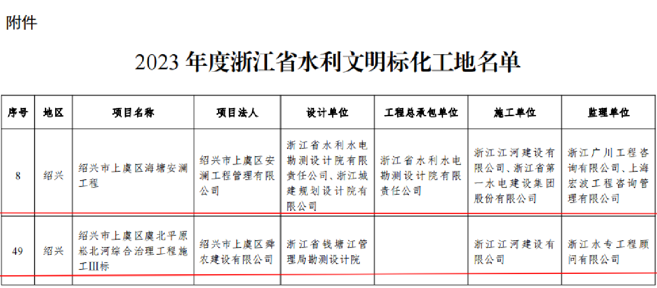 近日,公司承建的紹興市上虞區海塘安瀾工程、紹興市上虞區虞北平原崧北河綜合治理工程施工3標,被浙江省水...