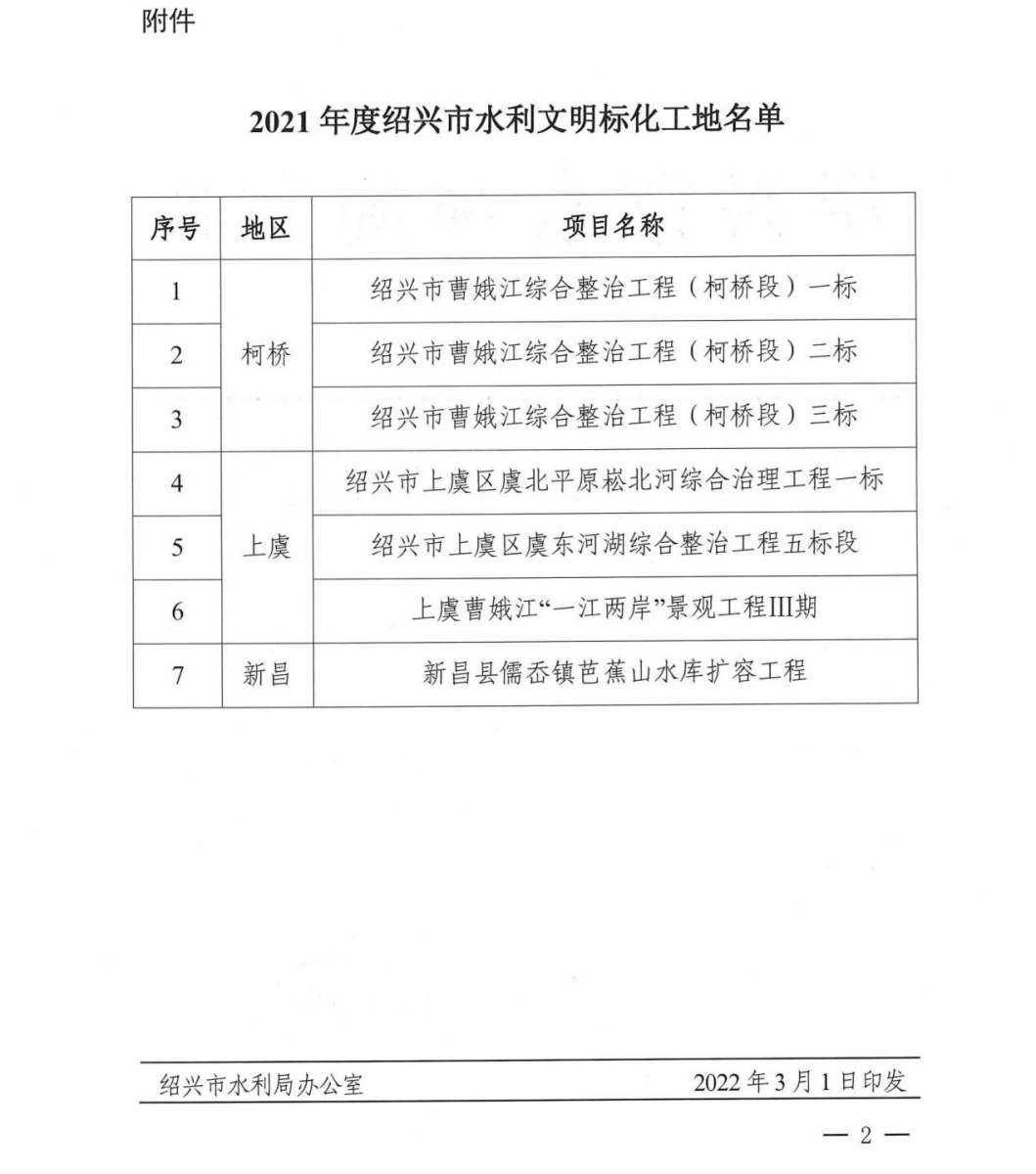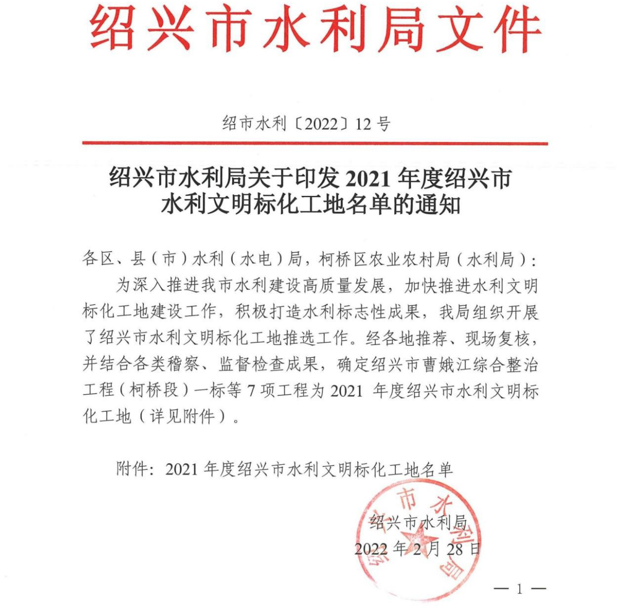 近日,經過紹興市水利局評選認定,根據各建設行政主管部門推薦上報、現場復核,結合各類稽察、監督檢查成果,由公司承建的“紹興市上虞區虞北平原崧北河綜合治理一標”與“紹興市上虞區虞東河湖綜合整治工程五標段”評選為2021年度紹興市水利文明標化工地。