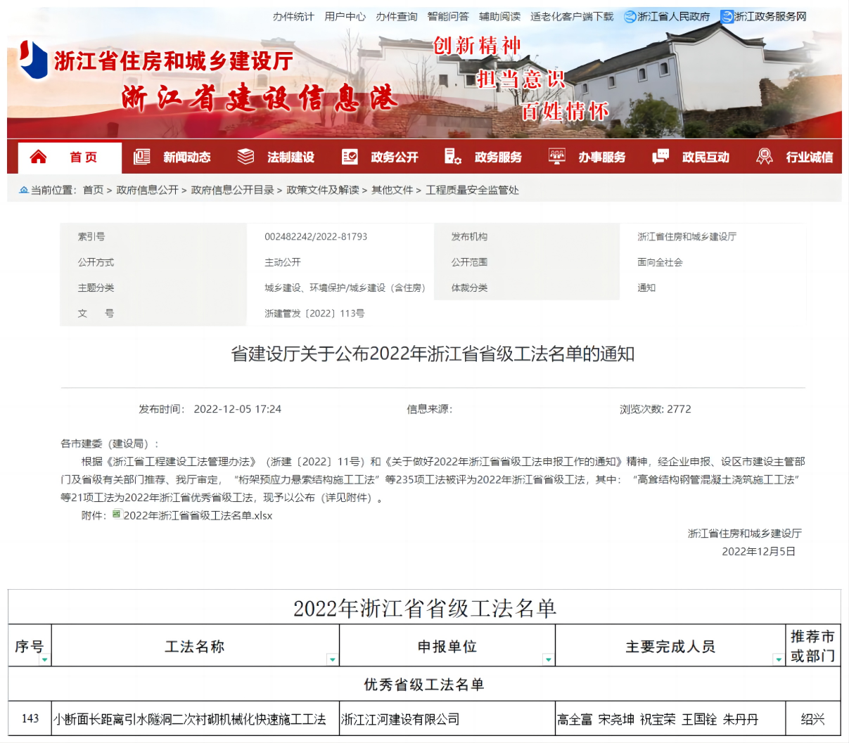 公司于2022年再獲一項由浙江省住房和城鄉建設廳批準的省級工法《小斷面長距離引水隧洞二次襯砌機械化快速施工工法》,兩項由國家水利工程協會批準的水利行業工法《基于U型防滲膜大壩面板表伸縮縫止水施工工法》和《鐵板砂地層超長拉森鋼板樁自行走式引孔壓入一體化靜壓施工工法》。