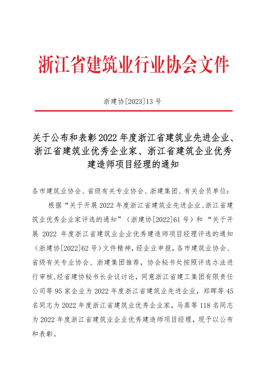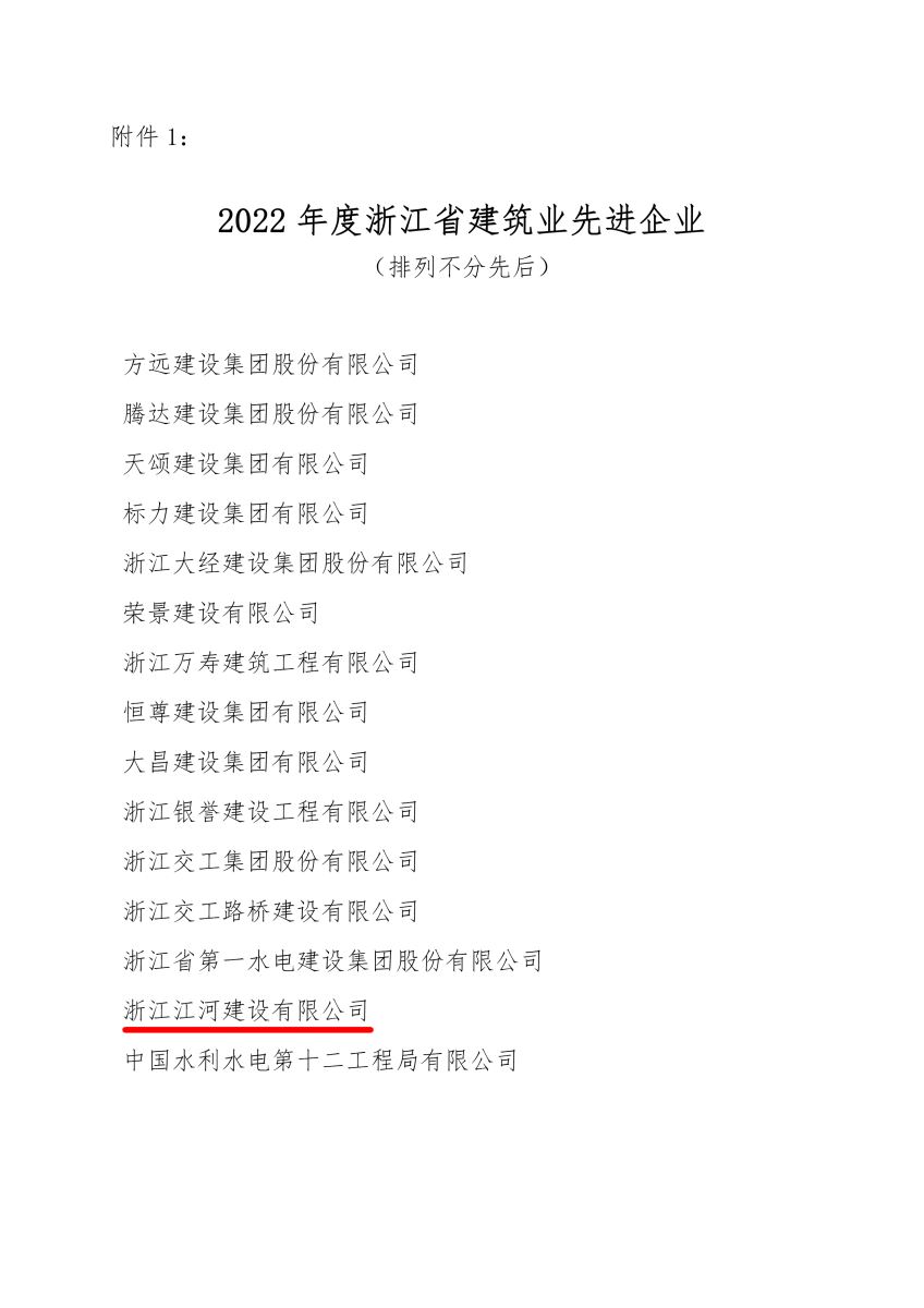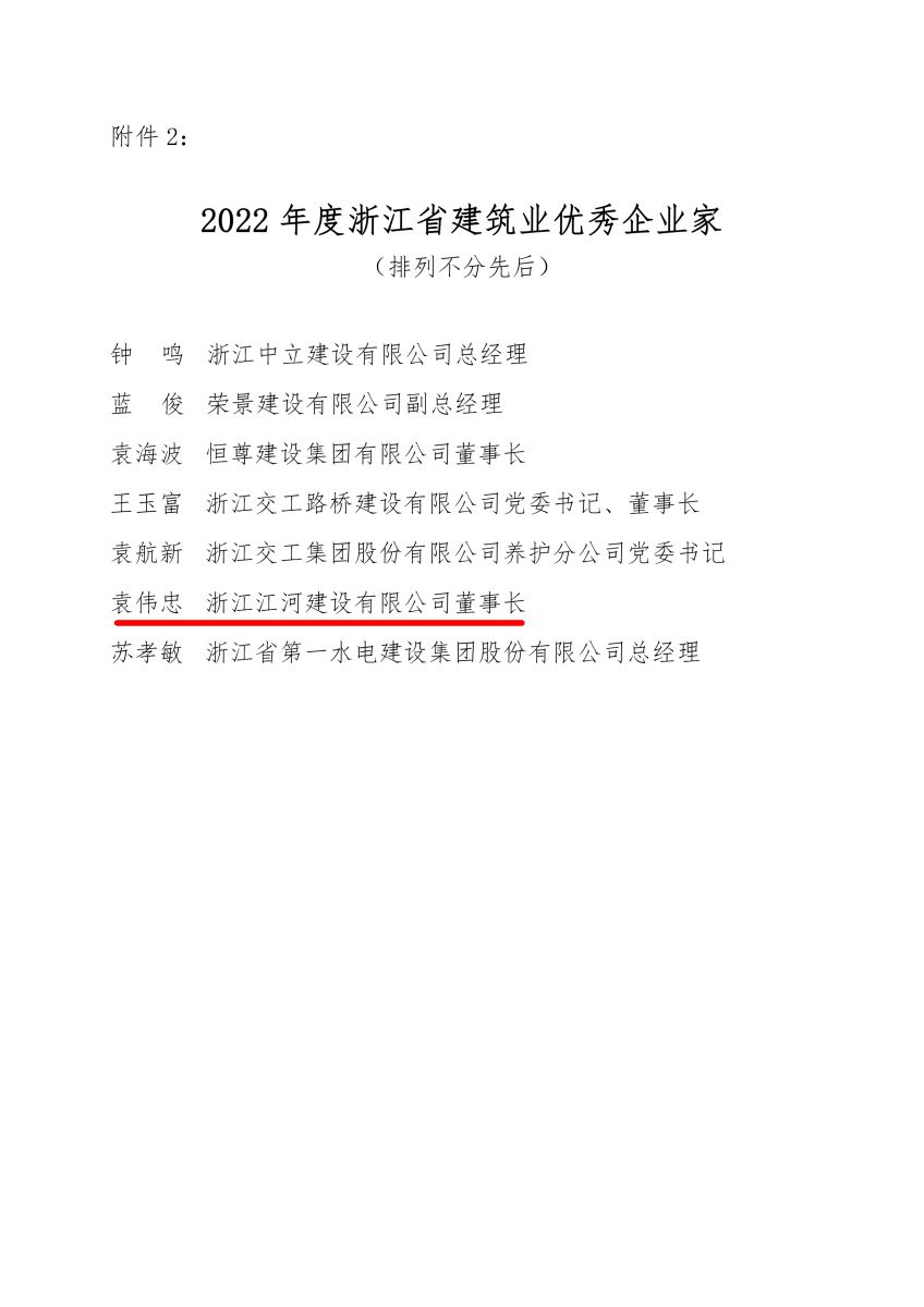 近日,浙江省建筑業行業協會發布2022年度浙江省建筑業先進企業榜單,公司蟬聯“2022年度浙江省建筑業先進企業”稱號,董事長袁偉忠被授予“2022年度浙江省建筑業優秀企業家”榮譽。