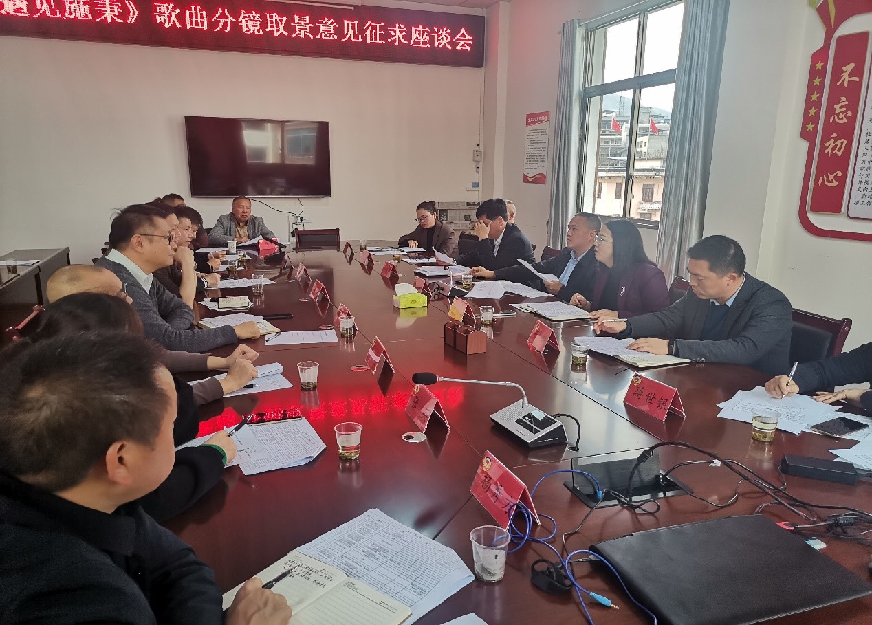 座談會上,創作老師講述了歌曲的創作背景,依賴當地豐富的旅游資源,煙波縹緲的?陽河、空明毓秀的杉木河、峰巒疊嶂的云臺山,為歌曲內容注入相得益彰的力量。隨后大家就部分歌詞提出修改和完善的寶貴意見,并部署好后期歌曲推廣和宣傳工作。