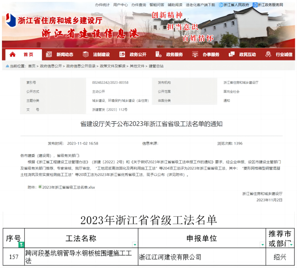 近日,公司于2023年再獲一項由浙江省住房和城鄉建設廳批準的省級工法《跨河段基坑鋼管導水鋼板樁圍堰施工工法》,五項由國家水利工程協會批準的水利行業工法《引水隧洞內置式榫插型預制管片拼裝施工工法》、《粉細砂層振動沉管碎石樁智能化成樁施工工法》、《裝配式“倒 T 型”蓋梁雙柱式橋墩安裝施工工法》、《組合式可周轉重復利用聲測管施工工法》和《鉆孔灌注樁精細化施工工法》。